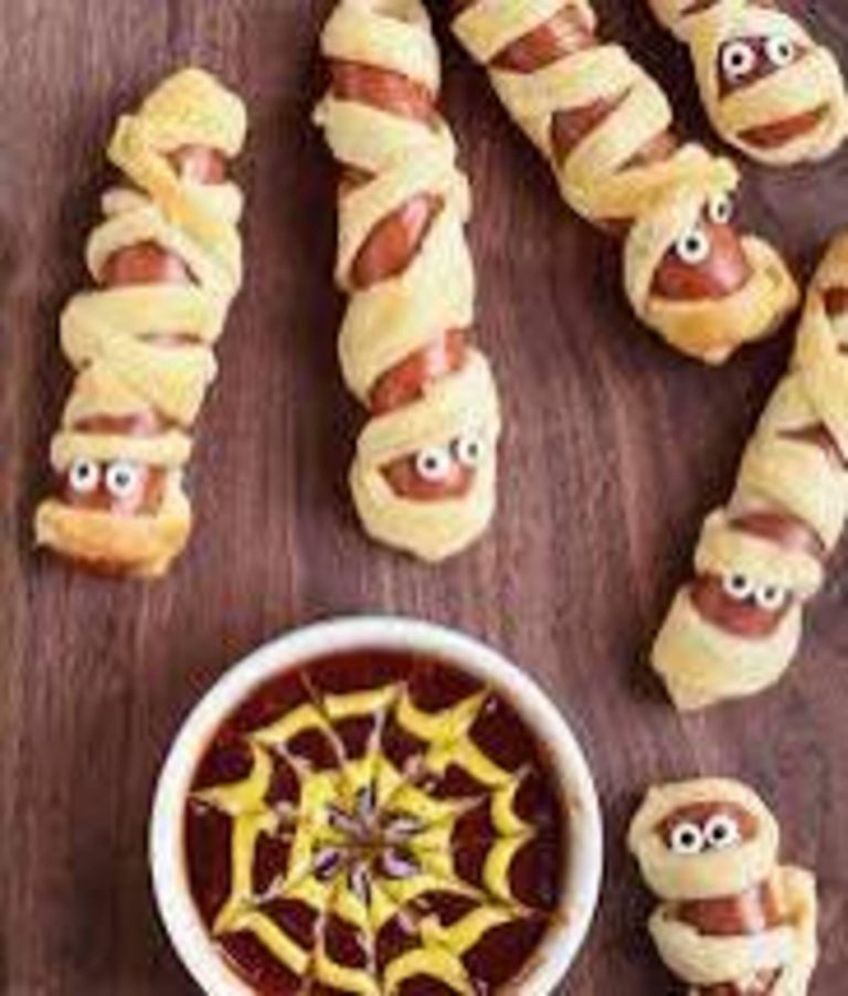 Ingredients: – 1 package of refrigerated crescent roll dough – 8 hot dogs – 2 tablespoons mustard or ketchup (for “eyes”)